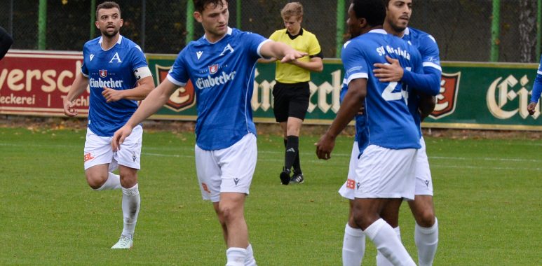 Die Blauen mussten ihre heißgeliebte Fünfer-Kette umbauen und den verletzten Delchad Jankir ersetzen. Dies erledigte Ahmed Belgacem mit seinem Startelfdebüt. Yannick Bahls verteidigte innen mit Justin Grete und Malik Dieudonne Mamadou und offensiv begann der zum Liebling der Arminenfans avancierte Frank „the Tank“ Emeka Munu. Den besseren Start erwischte jedoch die Elf aus dem Weserbergland, die sich zunächst mutig präsentierte und nach einem Freistoß aus dem Halbfeld auch in Führung ging. Die Blauen bekamen den Ball nicht aus der Gefahrenzone und im Nachsetzen musste Torwart Dominik Grimpe erstmals seit Ewigkeiten hinter sich greifen. Kalte Dusche in Bischofshol. Der Rückstand schien wie ein Weckruf gewirkt zu haben, denn die Blauen arbeiteten sich in die Partie und kamen fast postwendend zum Ausgleich. Frank „the Tank“ Emeka Munu ackerte sich sehenswert durch die Abwehrreihe der Schwalben und bediente Aron Gebreselasie, der nach 17 Minuten egalisierte. Einen Eckball von Vladyslav Pronko köpfte Yannick Bahls aufs Gehäuse der Gäste, jedoch ohne Ertrag. Lukas-Nigel Nensel setzte sich fünf Minuten später durch, sein Zuspiel auf Anis Nehme war jedoch etwas zu lang. Längst hatte der SVA die Zügel in der Hand und kontrollierte das Spiel. David Sitzer, nach langer Pause wieder in der Startelf, hatte aus der Drehung die Führung auf dem Huf, Lukas-Nigel Nensel im Direktduell mit dem Tünderaner Torwart kurz der Pause ebenfalls. Eine Führung für die Blauen wäre zur Halbzeit absolut verdient gewesen, jedoch ging es unentschieden in die Pause.