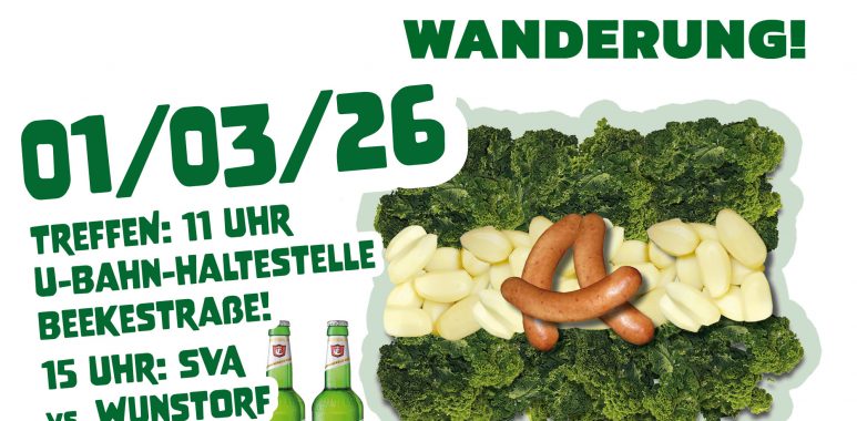 Es geht wieder los! Pünktlich zum verspäteteten Rückrundenauftakt lockt das Heimspiel gegen den 1. FC Wunstorf und im Vorfeld die grün-weiß-Grünkohlwanderung. Diese beginnt am kommenden Sonntag um 11 Uhr an der U-Bahn-Haltestelle Beekestraße, führt uns um 13 Uhr zum RKS und an den Grünkohltrog und lässt bei hoffentlich bestem Wetter ab 15 Uhr die Blauen gegen den 1. FC Wunstorrf anfeuern. Der ausführliche Vorbericht folgt wie gewohnt in den kommenden Tagen.